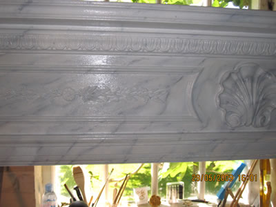The example here shows how we are able to finish mouldings, walls and furniture to match existing stone finishes, this example being carrera marbel.